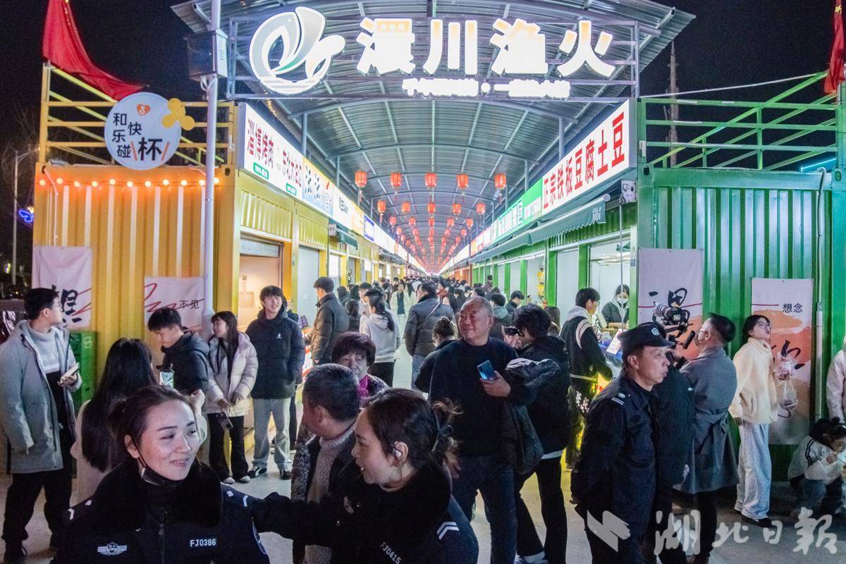 入夜,孝感偏水河畔,由51个集装箱搭建的“潘川渔火”夜市灯火通明。霓虹灯倒映在水中,伴随着商贩的叫卖声和食客的笑声,营造出冬夜最温馨的景象。