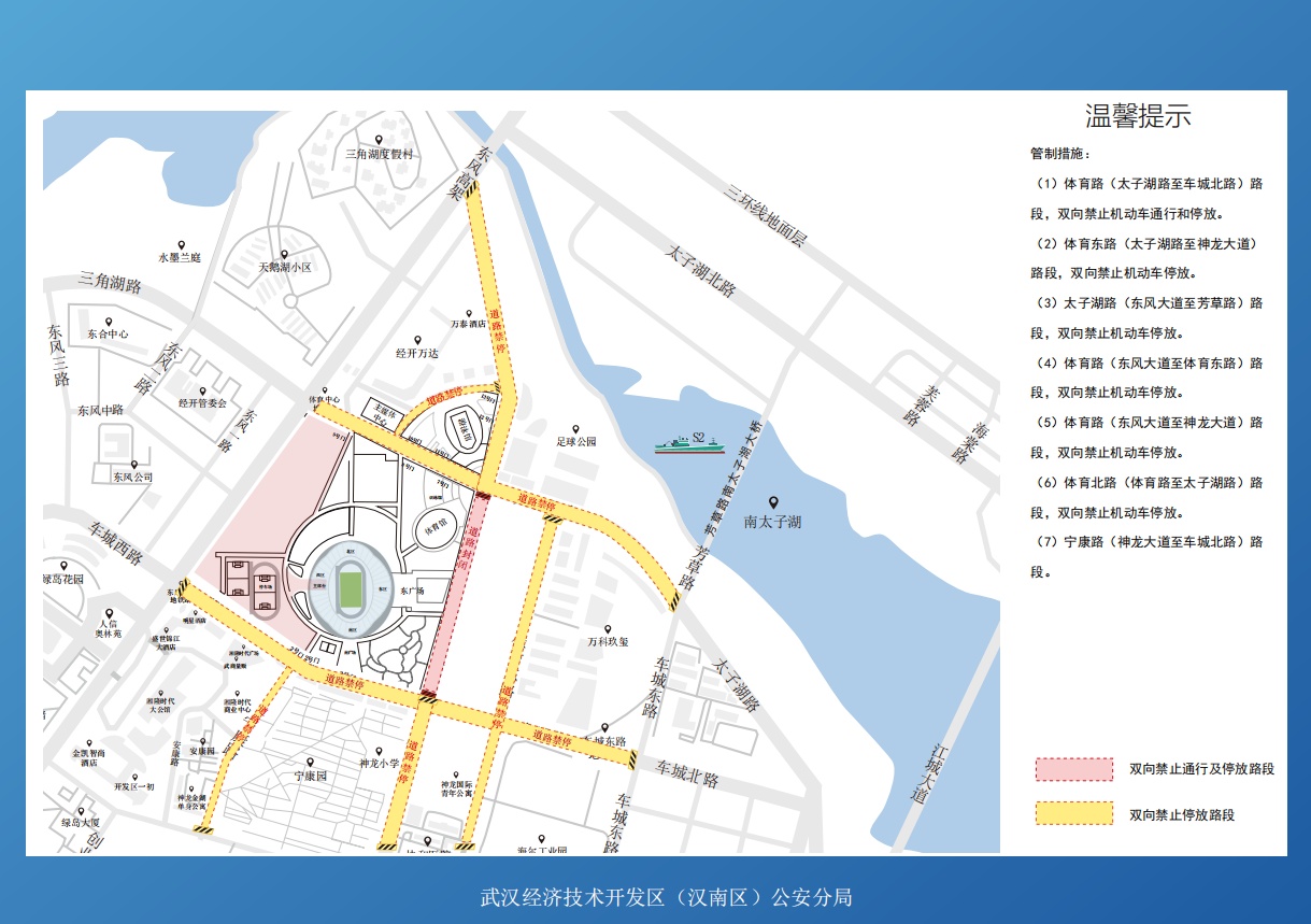 湖北日报讯(记者张景恒,信万新立、夏关迪)11月22日(周六)下午至晚间,武汉体育中心体育场将连续举办两场大型赛事。预计将有超过20,000名球迷和歌迷前来观看。武汉交警注:活动当天,中超联赛(15:30至17:30)和岳云鹏武汉演唱会(19:00至22:00)在武汉体育中心举行。各场比赛的观众和球迷不断进出该区域,给周边道路造成巨大的交通压力。武汉经济开发区公安局大队管理大队将根据赛事安排和实际情况,对武汉体育中心周边道路、停车场等采取临时管控措施。请前往观看的人员听从交警指挥,安全有序进入区域。 1、控制路段及道路:2025年11月22日12:00-22:301、禁止双向机动车通行、停车的路段:(1)体育路(太子湖路至车城北路)。 (2)视情况控制太子湖路(东风大道至体育路)路段。 。 2、双向禁止机动车停车路段: (1)体育东路路段(太子湖路至神龙大道)。 (2)太子湖路路段(东风大道至芳草路)。 (3)车城北路(东风大道至体育东路)。 (4)体育路(东风大道至神龙大道)。 (5)体育北路(体育路至太子湖路)。 (6)宁康路(神龙大道至车城北路)。 2、公共停车场(最大容量) 武汉体育中心周边设有8个停车场。 1、体育中心社会停车场(约2000个车位); 2、万达地下停车场(988个车位); 3、东风大道停车场(约1050个停车位,其中地上停车位630个)特大车位和 420 个停车位); 4、政务中心中央停车场(336个车位); 5、东河中心停车场(220个车位); 6、翔龙地下停车场(车位约300个); 7、宁康园停车场(约80个车位); 8、宏盛停车场(约200个车位)。三、推荐出行路线 1、绿色出行路线(推荐) (1)乘坐地铁3号线至体育中心站,从A口出站至体育中心5、7号门观众席(中超联赛观众至5号门,演唱会观众至7号门)。 。 。 2、出行路线自理(1)大川路-博岩路-博学路-车城西路-车城北路-体育路-体育中心社会停车场。 (2)龙阳大道-东风大道-东风中路-东风二路-停车场/东和中心停车场。 。 。 。四、温馨提示 1、由于赛事当天观众较多,道路交通流量较大周边体育中心增多。前往体育中心的人员应尽量避开高峰时段。请您合理安排高峰时段出行,尽量避免进入体育路(东风大道至神龙大道)、太原路。对于紫湖路(东风大道至芳草路)、体育东路、车城北路(东风大道至车城东路)、宁康路路段,需要通行的人员或车辆可选择绕行神龙大道、朝阳大道、太子湖路、江城大道等周边道路。 2、由于体育中心周边道路管制,周边社区居民可以提前规划好回家路线,避免拥堵。例如,在宁康花园,他们可能会错过神龙大道宁康花园的2号门;在翔龙社区,可以错过神龙大道、宁康路;在万科翡翠九溪社区,在车城东路可以俯瞰它们。 3. 如果您正在开车前往武汉体育中心观看赛事的,请听从工作人员指挥,将车辆规范有序停放在停车场。 4、自驾车观看中超联赛,建议从太子湖路、体育东路体育中心社会停车场入口进入;进入北路车车停车场16:00后开放,主要供观看演唱会的自驾车使用。要求音乐会和车辆适当规划路线,以避免拥堵。 5、由于活动当天体育中心周边道路拥堵,货车、危化品车辆不得进入东风大道(不含)-体育路-太子湖路-芳草路(不含)-车城东路(不含)-神龙大道(不含)-东风大道(不含)围成的区域。可绕过神龙大道、车城东路等周边道路。 Copyright © 2024-2026 黑蘑菇爆料视频-黑蘑菇爆料最新视频-蘑菇视频爆料网 版权所有
