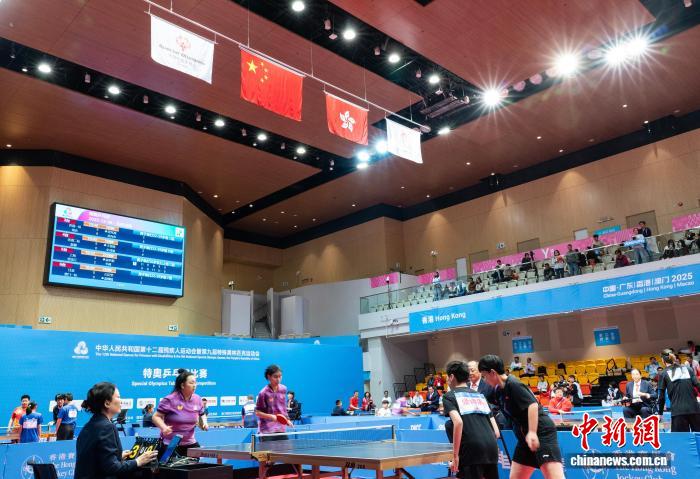 12月6日,第十二届全国残疾人运动会和第九届特殊奥运会(残奥会)特奥乒乓球比赛在香港荃湾体育馆开赛。图为香港队郑凯庆/刘静怡(紫色)女双组合对阵上海队选手。中新社记者 侯宇 摄