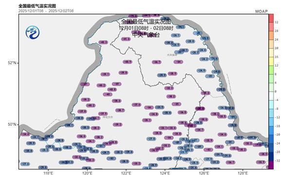 兴安岭大小山多地出现-30℃以下的极寒天气,其中内蒙古图里河-38.7℃(国家气象站下半年新低)、根河-38.6℃、密赫-36.9℃。