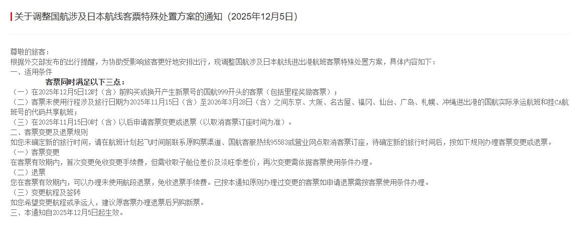 今日,国航、东航、南航等航空公司重新发布通知,调整涉及日本航线的客票特别处理方案:针对2025年12月5日(含)12:00前购买或兑换的相关客票,以及涉及出行日期在2025年11月15日(含)至2026年3月28日(含)之间的未使用客票,航班。 (包括中途停留)或日本境内的代码共享航班。可以免费取消或更改。国航客票适用条件须同时满足以下三点: 1. 2025年12月5日(含)12:00前购买或兑换以新客票号开头的国航999客票(含里程奖励客票); 2. 未使用的机票行程已涉及旅行日期 11月至11月期间,东京、大阪、名古屋、福冈、仙台、广岛、札幌、冲绳始发的实际中国实际承运航班以及CA航班号的联航航班2025年15月15日(含)及2026年3月28日(含); 3、2025年11月15日(含)0时后申请客票变更或退票(以客票取消预订时间为准)。东航适用条件: 1. 持有东航781客票的国际、地区或国内航班。客票中至少包含一趟未使用的涉及日本进港、出港或经停的航班(包括东航或其他航空公司的航班)。航班起飞日期为2025年11月15日(含)至2026年3月28日(含)。同一张机票上其他未使用的航段没有限制。 2、出票日期或补开日期:2025年12月5日(含)12:00前。三、取消行程日期:适用于2025年11月15日(含)起航班原定起飞时间取消行程的旅客。旅客在原定航班起飞后取消行程的,不适用此规定。分娩时间或2025年11月14日(含)之前。适用南航航班或使用南航航班号的合乘航班。上海航空适用条件适用于:开具1.781客票的国际、地区或国内航班。客票包含至少一趟未使用的涉及日本进港、出港或经停的航班(包括上海航空或其他航空公司的航班)。航班起飞日期为2025年11月15日(含)至2026年3月28日(含)。同一张机票上其他未使用航段的日期没有限制。 2、出票日期或补开日期:2025年12月5日(含)12:00前。三、取消行程日期:适用于2025年11月15日(含)起航班原定起飞时间取消行程的旅客。旅客在原定航班起飞时间之后或11月之前取消行程的,不适用此规定2025 年 14 月(含)。 11月14日,外交部和中国驻日本使领馆郑重提醒中国公民近期避免前往日本。在日中国人民应关注当地安全形势,增强安全意识,加强自我保健。 15日,多家航空公司陆续发布通知,旅行日期在12月31日之前、涉及日本相关航线且符合相关条件的机票可免费退票或改签。 Copyright © 2024-2026 黑蘑菇爆料视频-黑蘑菇爆料最新视频-蘑菇视频爆料网 版权所有